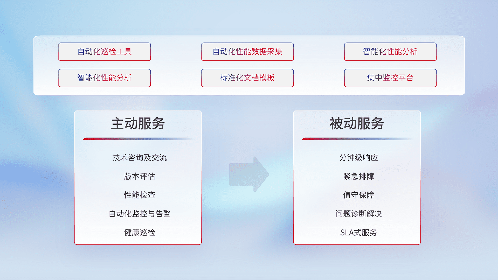智能化工具和标准化文档,,保障服务质量,,,提供主动服务(包含技术咨询、、版本评估、、性能检查、、、自动化监控与告警、、健康巡检)和被动服务包含(分钟级响应、、、紧急排障、、、、值守保障、、、问题诊断解决、、、、SLA服务)。。。
